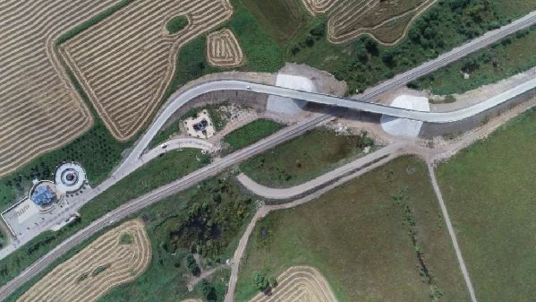 平改立工程K11公里道口,已建成的沙土橋梁??梢钥吹较聵虻妮o路和橋梁之間,完全沒有預留轉彎的空間。(8月28日 航拍圖)達日罕攝