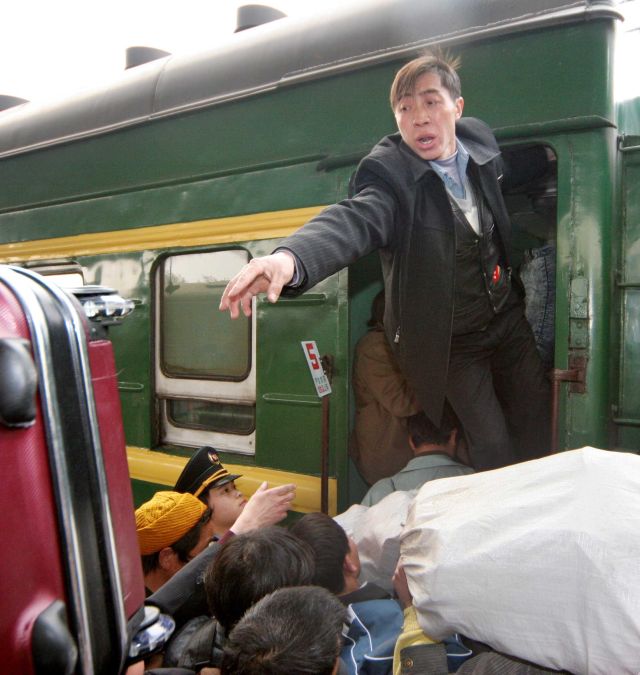 2004年,在廣州火車站登上返鄉列車的乘客通過車窗向外張望。