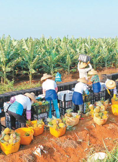 廣東湛江市徐聞縣盛產菠蘿,種植面積達35萬畝,年產量近50萬噸。春節臨近,菠蘿開始大量上市。圖為村民在田間將菠蘿打包裝車,準備銷往全國各地。羅艾樺 陳北跑攝影報道
