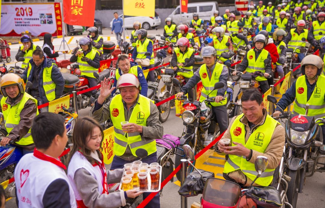 2019-01-21,廣東省佛山市順德區。摩托返鄉大軍中,出現一張俏麗的笑臉,給農民工大哥端上一杯熱茶。作者:獲得生命