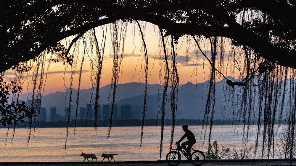 2019-01-19,福建省福州市。日落時分,休閑運動的騎車健身者帶著小狗一起享受溫暖的陽光。作者:周志強