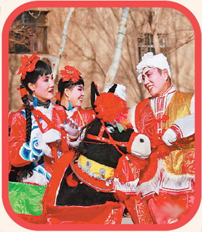甘肅敦煌市2019迎新春社火大賽活動現場,參賽隊員表演社火跑驢。張曉亮攝(人民視覺)
