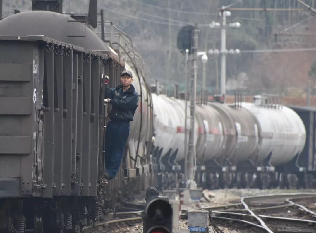2019-02-02,長沙車務段路口鋪車站。在搶運航油、汽油等油品的專列上,連接員掛在車梯上編組列車。作者:麥子熟了