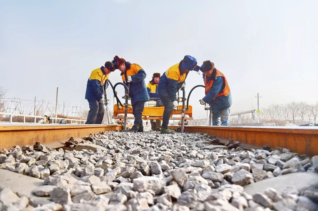 2019-02-06,河北省唐山市。北京局鐵路集團公司所轄的七灤線上,工務工人正在搗固線路,確保春運行車安全。作者:養路工