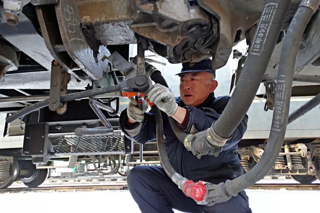 2019-02-08,唐山機務段。大年初四,唐山機務段的整備人員正在檢修機車走行部,確保出庫機車質量良好。作者:樂亭閑人