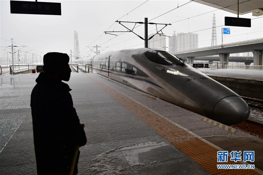 2月10日,一列高鐵列車迎著風雪駛入鄭州東站。當日是農歷正月初六,多地迎來返程客流高峰。 新華社記者 馮大鵬 攝