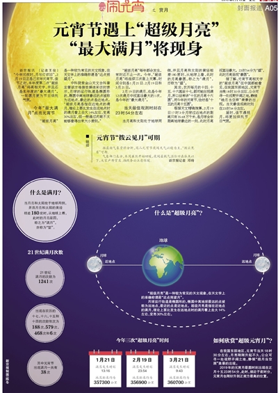 據了解,元宵節亮相天宇的“超級月亮”在中國都能看見,在我國東部地區,元宵節當晚18時30分左右,公眾可尋一處視野開闊之地,靜候“皓月當空照”美景的出現。當天最佳觀測時刻在23時54分左右。