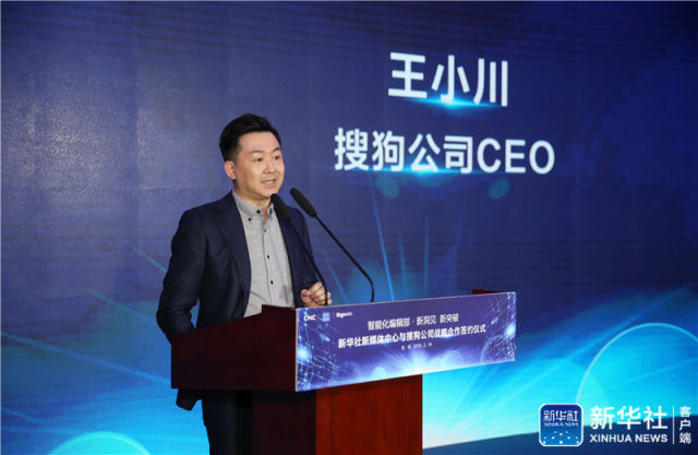 2月19日,新華社聯合搜狗公司在京發布全新升級的站立式AI合成主播并推出全球首個AI合成女主播。圖為搜狗公司CEO王小川致辭。新華社記者 肖磊濤 攝