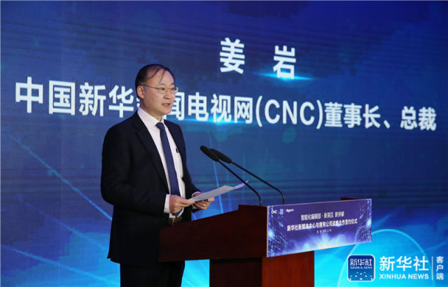 2月19日,新華社聯合搜狗公司在京發布全新升級的站立式AI合成主播并推出全球首個AI合成女主播。圖為中國新華新聞電視網有限公司(CNC)董事長、總裁姜巖致辭。新華社記者 肖磊濤 攝