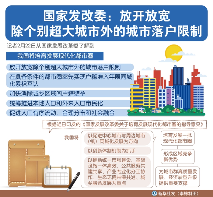 新華社北京2月22日電(安蓓、齊琪)記者22日從國家發展改革委了解到,我國將培育發展現代化都市圈。放開放寬除個別超大城市外的城市落戶限制,在具備條件的都市圈率先實現戶籍準入年限同城化累積互認,加快消除城鄉區域間戶籍壁壘,統籌推進本地人口和外來人口市民化,促進人口有序流動、合理分布和社會融合。