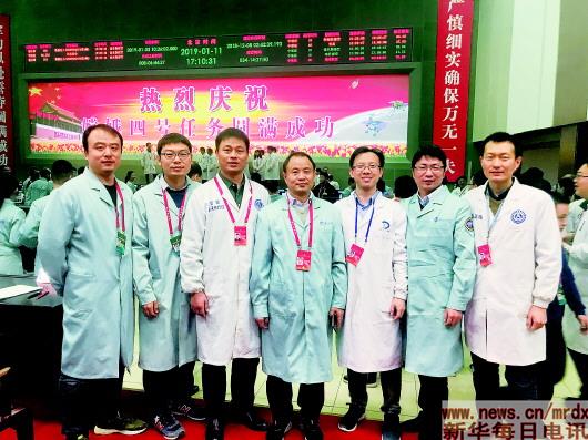 ▲1月11日,北京航天飛行控制中心,科普載荷總設計師謝更新(右四)、副總指揮楊小俊(右五)、主任設計師張元勛(右二)以及航天五院、中科院光電所等單位參研人員合影慶祝嫦娥四號任務圓滿成功?!∈茉L者供圖