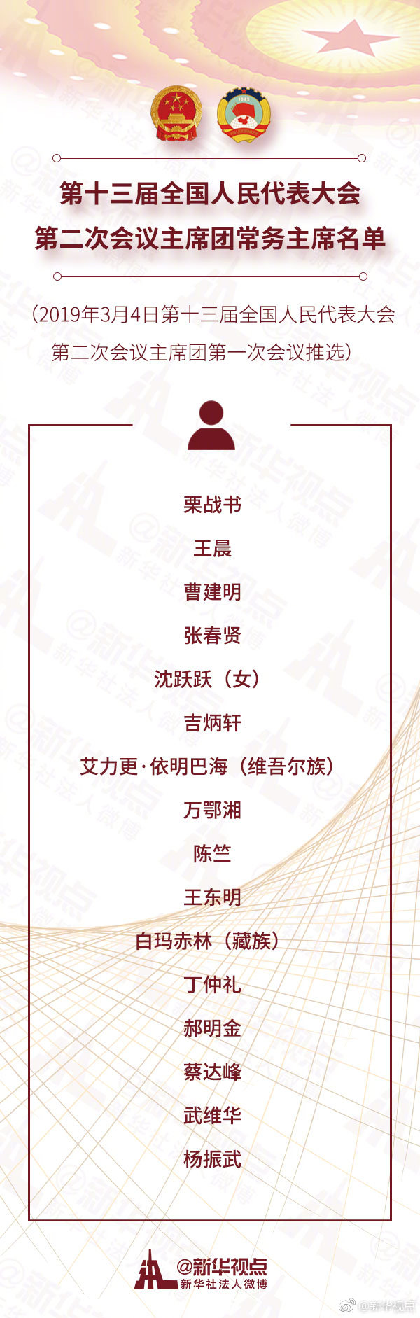 (2019年3月4日第十三屆全國人民代表大會第二次會議主席團第一次會議推選)