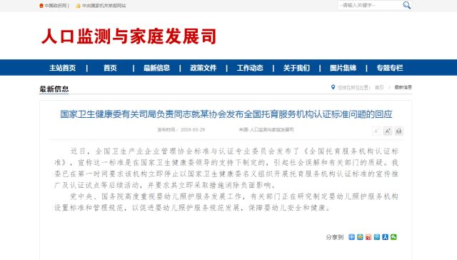 近日,全國衛生產業企業管理協會標準與認證專業委員會發布了《全國托育服務機構認證標準》,宣稱這一標準是在國家衛生健康委領導的支持下制定的,引起社會誤解和有關部門的質疑。我委已在第一時間要求該機構立即停止以國家衛生健康委名義組織開展托育服務機構認證標準的宣傳推廣及認證試點等后續活動,并要求其立即采取措施消除負面影響。