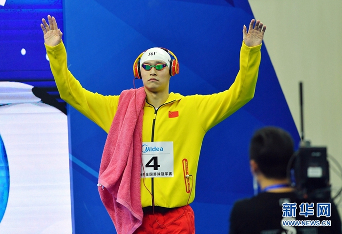 3月27日,浙江隊選手孫楊在賽前出場。當日,在青島舉行的2019年全國游泳冠軍賽暨世錦賽選拔賽男子800米自由泳決賽中,浙江隊選手孫楊以7分48秒03的成績獲得冠軍。 新華社記者朱崢攝