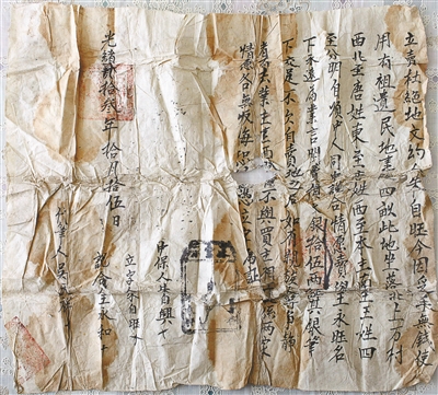 墓主人有可能姓朱。寶頂西北,是王鳳榮家的宅院。王女士收拾屋子時,曾發現一張百年前的《土地買賣文書》。這張宣紙文書有A3紙大小,綿軟泛黃,滿是褶皺。王鳳榮將其小心翼翼地攤在茶幾上,呈現出一篇并不算美觀的毛筆字,其大意為:賣主名叫朱自旺,因手頭缺錢,將祖遺民地一處四畝,賣予王永旺名下,賣價文銀十五兩,立字為證,光緒二十三年(1897年)。文書上還有三處紅章,但字跡已是漫漶不清。