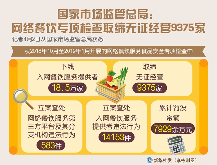 新華社北京4月2日電(記者趙文君)記者2日從國家市場監管總局獲悉,在近期開展的網絡餐飲服務食品安全專項檢查中,下線入網餐飲服務提供者18.5萬家,取締無證經營9375家。