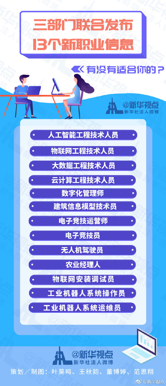 “新職業是在向社會公開征集的基礎上,經專家評審、公示征求意見后,按程序遴選確定的?!比肆Y源社會保障部有關負責人表示,此次共征集到43個建議職業,經專家嚴格評審,報人力資源社會保障部、國家市場監管總局、國家統計局批準,最終發布了上述13個新職業信息。