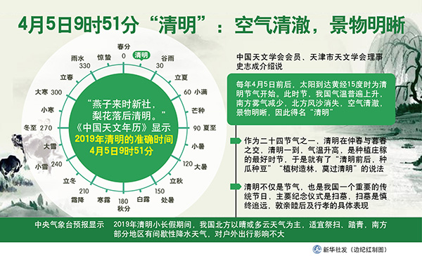 中國天文學會會員、天津市天文學會理事史志成介紹說,每年4月5日前后,太陽到達黃經15度時為清明節氣開始。此時節,我國氣溫普遍上升,南方霧氣減少,北方風沙消失,空氣清澈,景物明晰,因此得名“清明”。