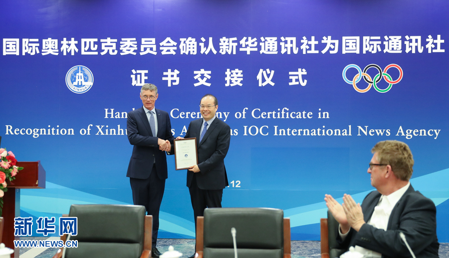 新華社北京4月12日電 國際奧委會國際通訊社證書交接儀式12日在北京舉行。新華社副社長嚴文斌代表新華社接受證書,國際奧委會新聞委員會主席、媒體運行部總監安東尼·埃德加代表國際奧委會主席巴赫遞交證書。