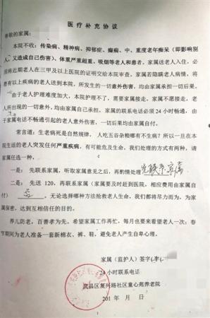 接收老人前,童心苑要求老人家屬簽訂的醫療補充協議。