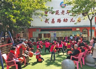 這是一場老幼同樂活動,孩子和老人來自武漢市的老幼同養機構——童心苑。童心苑實際是個代稱,由武昌路幼兒園和武昌區復興路社區的童心苑老年公寓(下稱“老年公寓”)共同組成。在這里,養老院和幼兒園開在一起,老人和幼兒結合供養。
