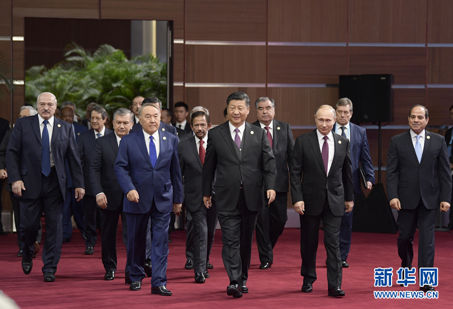4月26日,國家主席習近平在北京出席第二屆“一帶一路”國際合作高峰論壇開幕式,并發表題為《齊心開創共建“一帶一路”美好未來》的主旨演講。這是習近平和出席開幕式的外方領導人共同步入會場。 新華社記者李學仁攝
