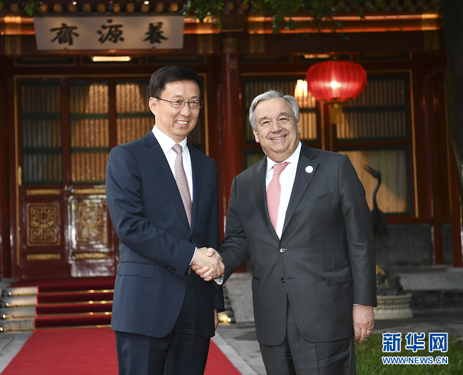 4月27日,中共中央政治局常委、國務院副總理韓正在北京釣魚臺國賓館會見聯合國秘書長古特雷斯。新華社記者 謝環馳 攝