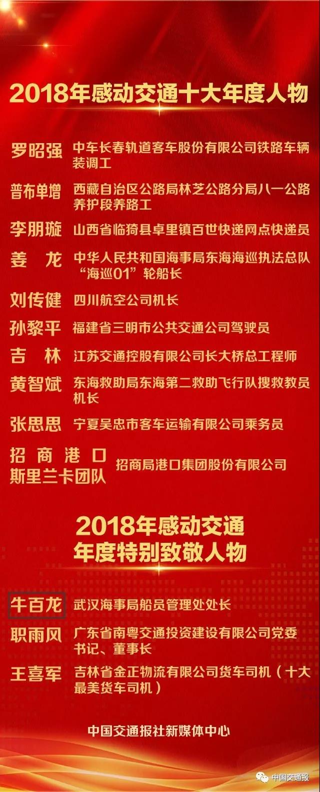 另外,將青春和生命奉獻給海事交通事業的武漢海事局船員管理處處長牛百龍;胸懷大愛,積極踐行“大道為公”理念的廣東南粵交通投資建設有限公司黨委書記、董事長職雨風;400萬公里安全駕駛、細心工作、熱心助人的吉林省物流貨車司機王喜軍榮獲“2018年感動交通年度特別致敬人物”稱號。