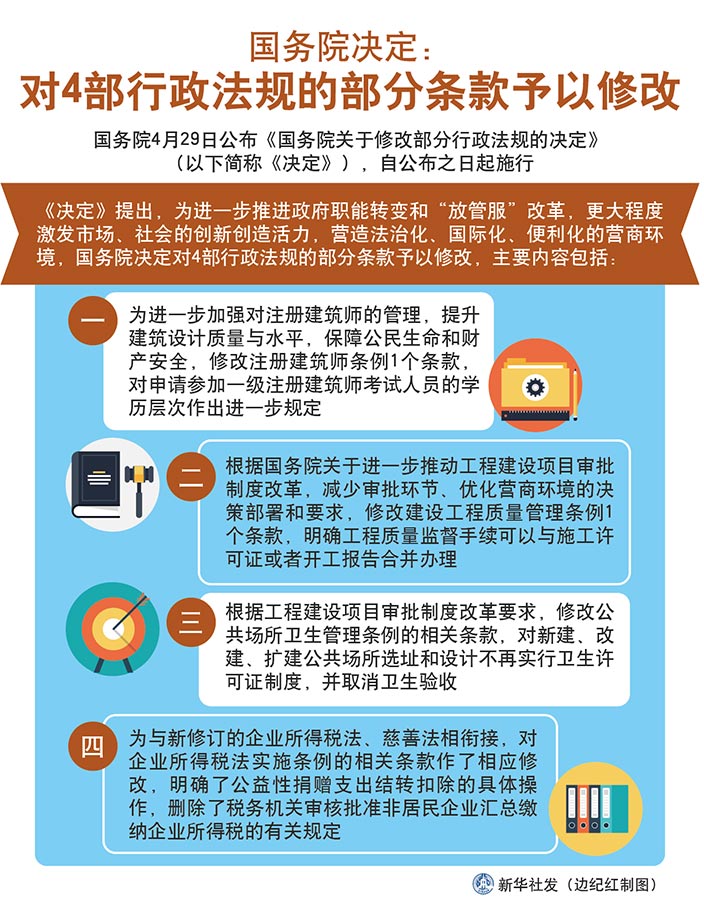 為進一步推進政府職能轉變和“放管服”改革,更大程度激發市場、社會的創新創造活力,營造法治化、國際化、便利化的營商環境,國務院對涉及的行政法規進行了清理。經過清理,國務院決定:對4部行政法規的部分條款予以修改。
