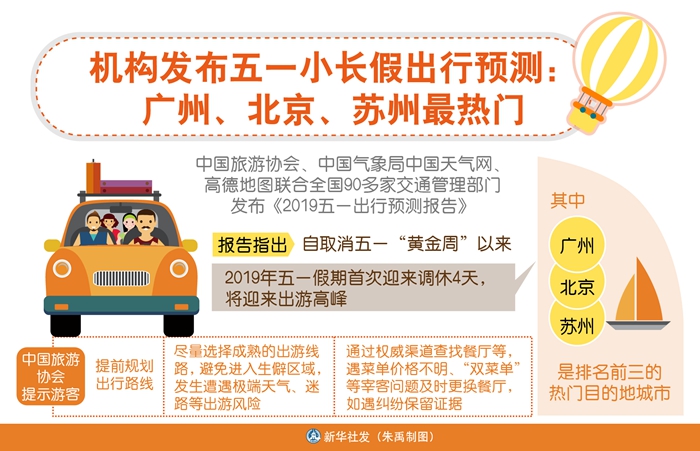新華社北京4月29日電(記者魯暢)中國旅游協會、中國氣象局中國天氣網、高德地圖聯合全國90多家交通管理部門發布《2019五一出行預測報告》,報告指出,自取消五一“黃金周”以來,今年五一假期首次迎來調休4天,將迎來出游高峰,其中廣州、北京、蘇州是排名前三的熱門目的地城市。