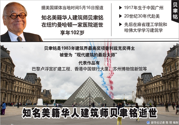 新華社紐約5月16日電(記者長遠 潘麗君)據美國媒體16日報道,知名美籍華人建筑師貝聿銘在紐約曼哈頓一家醫院逝世,享年102歲。