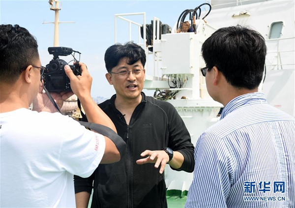 5月18日,航次首席科學家、中國科學院海洋研究所研究員徐奎棟(中)在接受采訪。新華社記者 李紫恒 攝