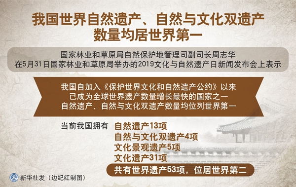 周志華介紹說,33年來,我國的世界遺產事業從無到有、從小到大,在世界遺產申報、保護、利用和管理等方面取得舉世公認的成就。目前我國共有世界遺產53項,位居世界第二。除了自然遺產、自然與文化雙遺產以外,還有文化景觀遺產5項、文化遺產31項。