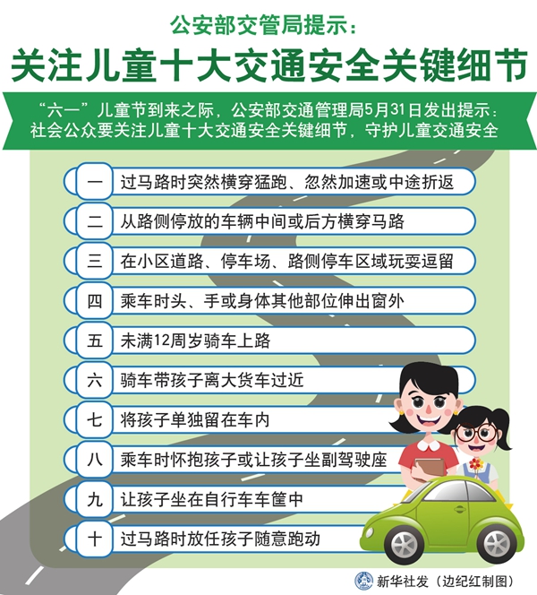 新華社北京5月31日電(記者王茜)兒童的交通危險認知、自我保護能力不強,容易受到交通意外的傷害?!傲弧眱和澋絹碇H,公安部交通管理局31日發出提示:社會公眾要關注兒童十大交通安全關鍵細節,守護兒童交通安全。
