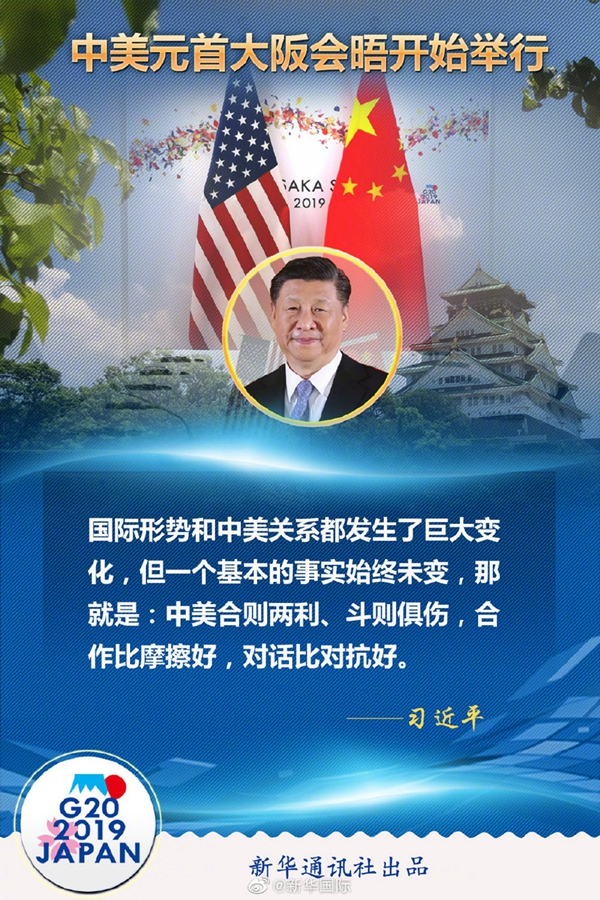 習近平在會晤開始時說,很高興同總統先生在大阪見面。48年前,也就是1971年,就在離這里100多公里的名古屋,參加第三十一屆世界乒乓球錦標賽的中美乒乓球運動員進行了友好互動,這就是后來人們說的“乒乓外交”的開啟,創造了“小球轉動大球”的歷史佳話。8年之后的1979年,中美建立了外交關系?;仡櫧ń灰詠淼?0年,國際形勢和中美關系都發生了巨大變化,但一個基本的事實始終未變,那就是:中美合則兩利、斗則俱傷,合作比摩擦好,對話比對抗好。近來,我同總統先生通過電話和書信保持著密切聯系。今天,我愿同總統先生就事關中美關系發展的根本性問題交換意見,為下階段兩國關系發展定向把舵,推進以協調、合作、穩定為基調的中美關系。