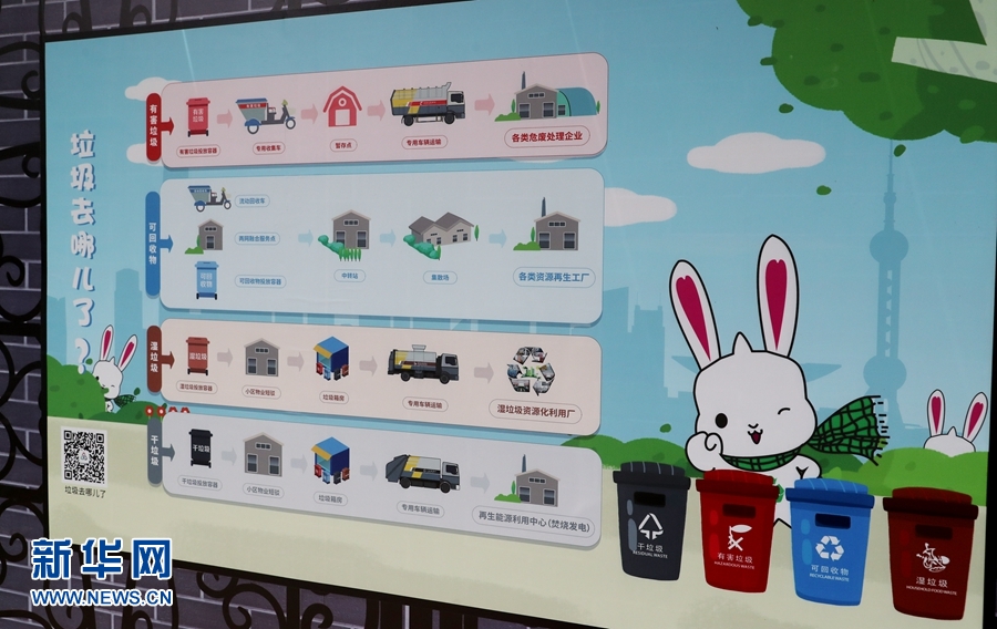 在虹口區嘉興路街道“宇泰景苑”小區內,小區垃圾房外的裝飾墻上對分類后不同垃圾的去向進行詳解(6月24日攝)。 新華社記者 方喆 攝