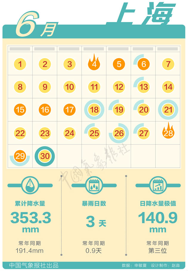 但是上海降雨可不小,累計降雨量達353.3毫米,比常年同期191.4毫米多83%。6月30日上海中心城區(徐家匯站)日降水量達140.9毫米,是1874年有記錄以來6月日最大雨量的歷史第三位,為近20年出現的最大暴雨。