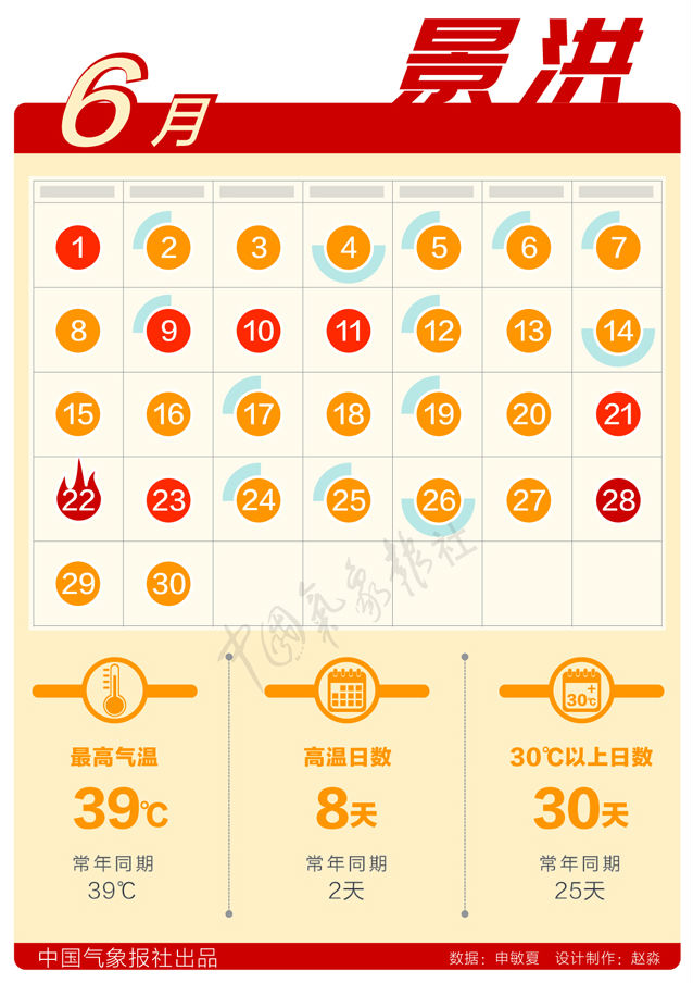 景洪:云南景洪高溫日數為8天,為歷史同期最多,比常年同期偏多6天;6月逐日最高氣溫均超過30℃,為歷史同期最多;6月極端最高氣溫39℃,追平了6月最高氣溫記錄。而且降水稀少:6月降水量65.6毫米,僅次于1961年和2012年為歷史同期第三少年;6月無降水日數17天,為1961年以來同期最少。