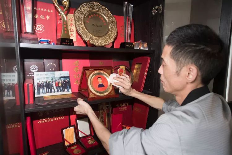 吳元渺在擦拭自己的全國五一勞動獎章。柜子里擺放的都是他獲得的各種榮譽證書和獎章。