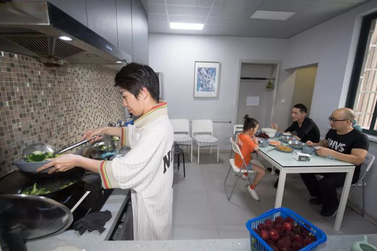 吳元渺在跑步機上鍛煉。張海林和朱丹丹的女兒、8歲的張也弛給“吳老師爸爸”送來一碗楊梅。