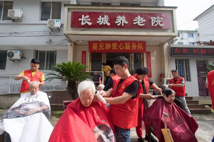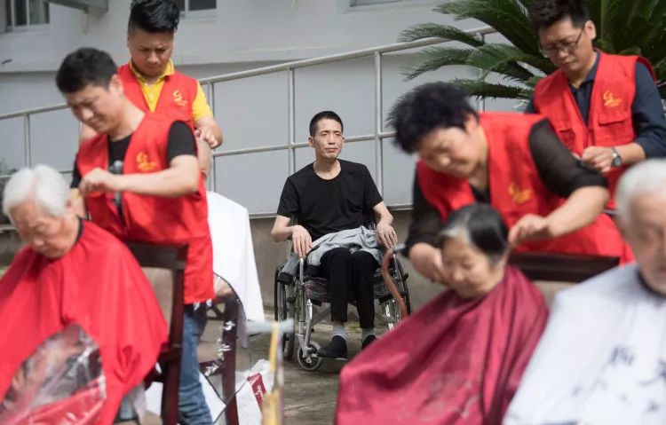 吳元渺愛心服務隊的志愿者們在臨海市一家養老院為老人義務理發。吳元渺坐在一個角落靜靜地看著他們。