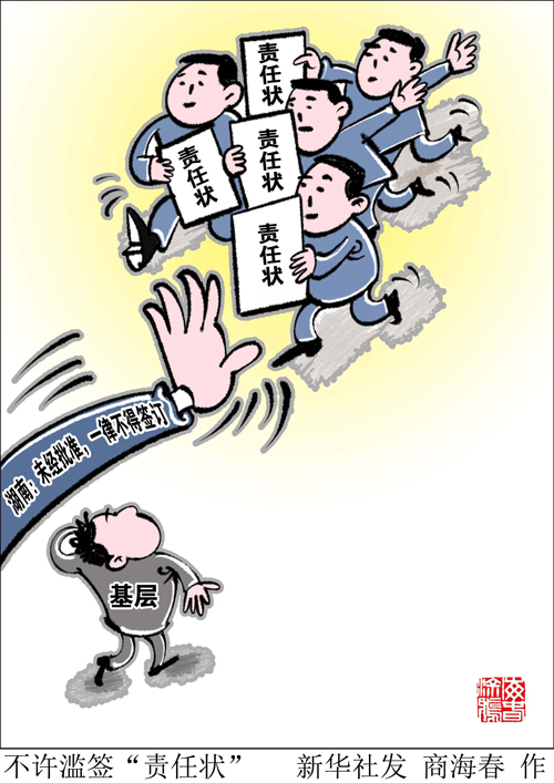 一味問責導致部分基層干部“虱多不癢、債多不愁”。一名基層干部向半月談記者傾訴:自己跑到縣里一個會場,“埋頭就在一沓責任狀上簽字,也不看是關于什么內容,反正出了事責任都在鄉鎮”。他以該省新出臺的一份關于防控兒童青少年近視的文件舉例說,里面仍然要求“省與市簽責任書,市以下政府逐級簽責任書”。
