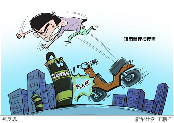 漫畫:須反思 近日,一位鄭州市民騎電動車撞上隔離樁受傷,經搶救無效死亡。記者在鄭州采訪了解到,醫院曾接診過很多撞隔離樁的受傷者,有的破皮流血,有的刺穿腳掌,有的摔斷腿骨。隔離樁變“傷人樁”警示城市管理不能任性粗放,應堅持以人為本,要像繡花一樣精細,否則害民不淺。新華社發 王鵬 作