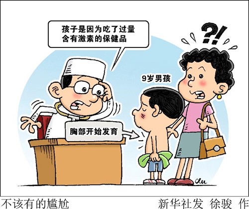 “起初是孩子不愿意去上游泳課了,也不說原因。直到有一次出去吃飯時,孩子把湯倒在了身上,卻死活不讓我脫上衣,才發現孩子的乳房竟然發育了?!焙坪茓寢尷钆扛嬖V記者,經兒科醫生診斷,是因為吃了不少補鋅的保健品導致激素紊亂,生長加速。