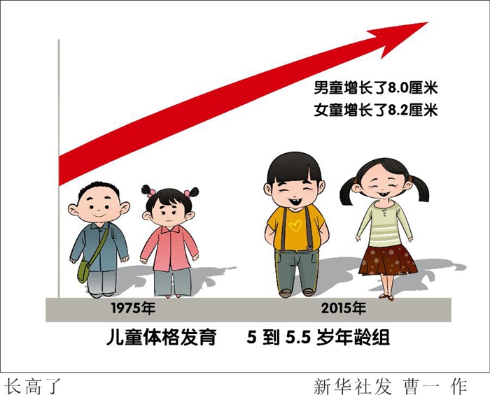 國家衛健委一項針對9市7歲以下兒童體格發育的調查也印證了這條“曲線”:從1975年到2015年,我國兒童身高、體重指標均持續快速增長。以最具代表性的5到5.5歲年齡組為例,男童和女童身高分別增長了8.0厘米和8.2厘米。