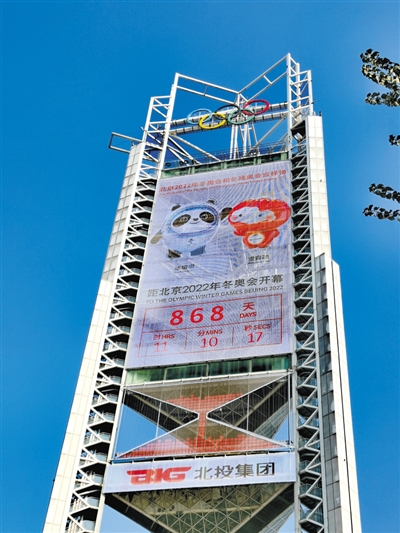北京冬奧會倒計時裝置是近1000平方米的LED顯示屏,搭設在奧林匹克公園中心區核心位置的玲瓏塔上。