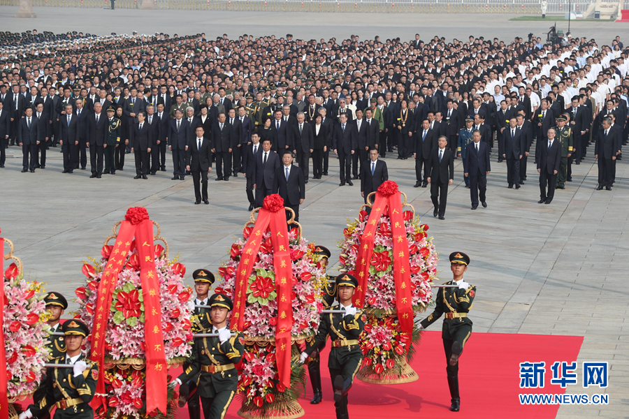 紀念碑前,4000多名各界代表手持鮮花,列隊肅立。他們中有年逾九旬的老戰士、老同志,有胸前佩戴著紅飄帶的烈士親屬,有國家勛章和國家榮譽稱號獲得者代表,有參加全國民族團結進步表彰大會的代表,有朝氣蓬勃的青年學生和少年兒童。