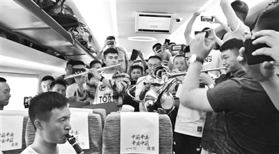 10月6日晚,現場拍攝視頻的一名聯合軍樂團成員告訴北京青年報記者,視頻的一幕發生于10月4日,聯合軍樂團來自不同單位的成員回撤,坐上了從北京開往廣州的高鐵,大家以后難有機會再相聚,就想再合奏一次,為此次任務畫一個圓滿的句號。于是,幾名成員拿出樂器,即興演奏了《歌唱祖國》和《鋼鐵洪流進行曲》,其他成員應聲合唱,吸引了其他乘客、列車工作人員圍觀,有人自發加入合唱,有人聽得紅了眼眶。