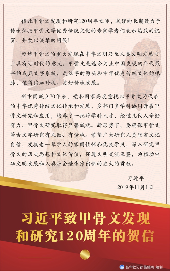 習近平在賀信中指出,殷墟甲骨文的重大發現在中華文明乃至人類文明發展史上具有劃時代的意義。甲骨文是迄今為止中國發現的年代最早的成熟文字系統,是漢字的源頭和中華優秀傳統文化的根脈,值得倍加珍視、更好傳承發展。