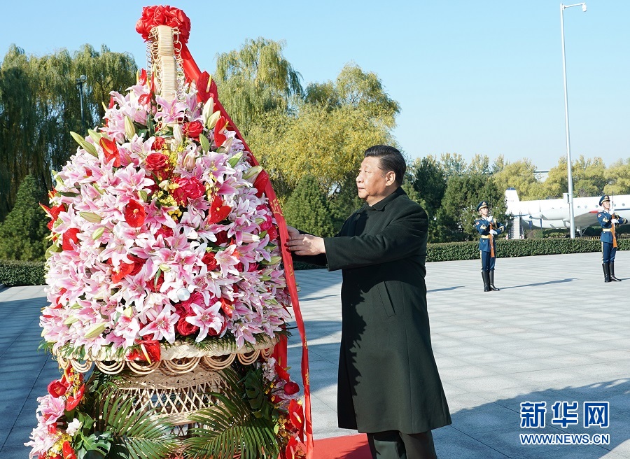 11月8日,中共中央總書記、國家主席、中央軍委主席習近平出席慶??哲姵闪?0周年主題活動,代表黨中央和中央軍委,對空軍成立70周年表示熱烈祝賀,向空軍全體官兵致以誠摯問候。這是習近平來到位于北京市昌平區的中國航空博物館,向人民空軍英烈敬獻花籃。 新華社記者 李剛 攝